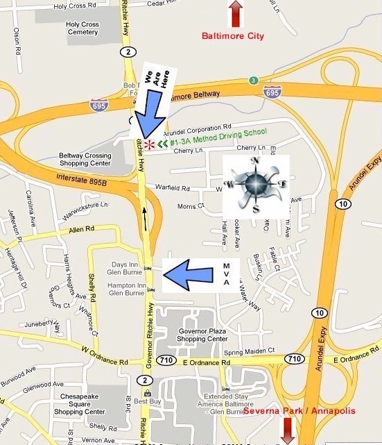 Directions to the Glen Burnie Office of #1-3A Method Driving School
